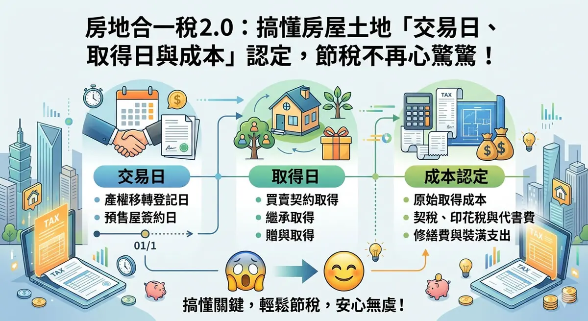 我們今天的主角有三個:「交易日」、「取得日」 以及 「取得成本」。這三者構成了房地合一稅的黃金三角,缺一不可。